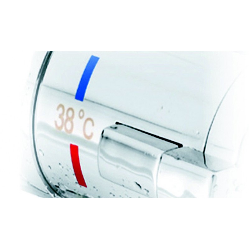 Blokační tlačítko na hlavici zabraňuje opaření - respektive samovolnému spuštění teplejší vody než je 38° C. Můžete tak být v klidu, že se ani vaše děti nechtěně neopaří. Pro děti je manipulace se zarážkou podobně bezpečná, jako je např. zabezpečení čistících prostředků nebo léků bezepčnostním uzávěrem (pro otevření je nutné současně stlačení a otočení uzávěru). Při poruše na přívodu studené vody se horká okamžitě uzavře, takže nemůže dojít k opaření.