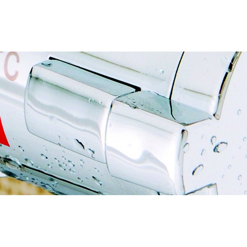 Termostatická baterie nemá páku, ale speciální ovládací hlavice, zabezpečené proti nechtěnému pohybu. Takže se vám již nemůže stát, že při sprchování nechtěně strčíte do páky a začne vám téct horká či studená voda. Změna teploty je kdykoli a velmi jednoduše možná stlačením blokačního tlačítka. Toto zabezpečení je vyvinuto proto, aby každou změnu teploty vody nad nastavenou hranici bylo možné provést pouze z vlastní vůle, nikoli nechtěně.