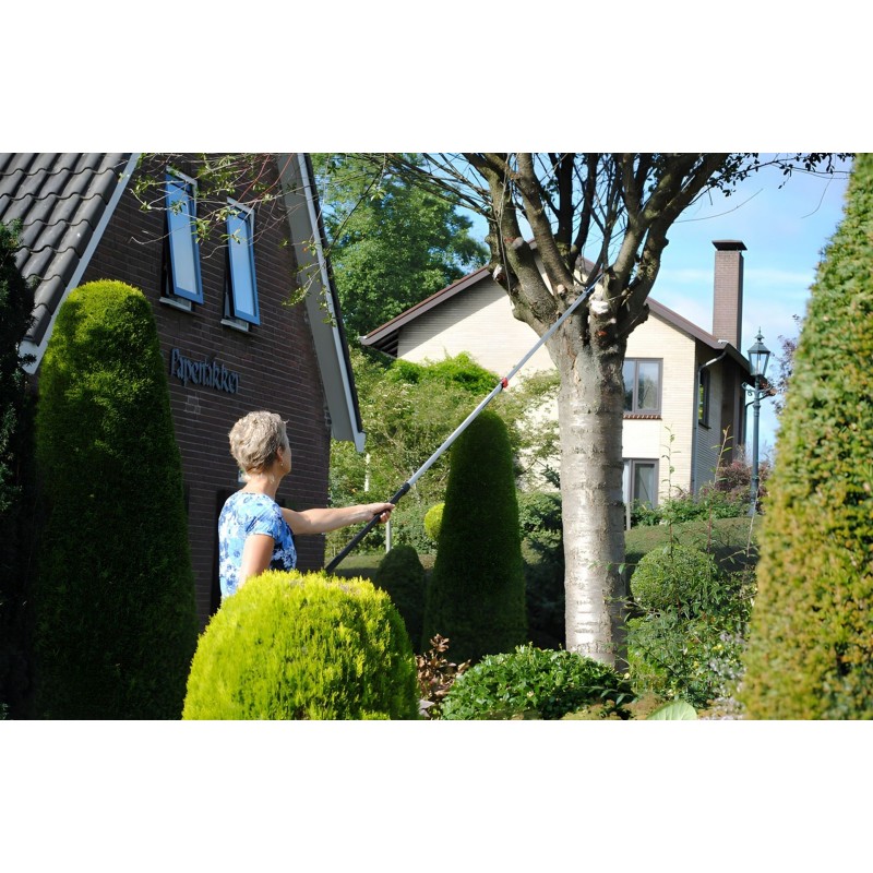 Hliníková násada má oválný tvar, díky kterému máte velmi přesnou kontrolu nad směrem řezu, což budete potřebovat při prořezávání ve velké výšce. Navíc tento tvar poskytuje větší pevnost a tuhost po celé délce tyčové pily a minimalizuje ohýbání. Při plném rozložení násady pak pila dosahuje maximální délky 2,7 metru. V kompletně složeném stavu má pila naopak pouhých 1,75 m, což oceníte při jejím transportu. Dva zajišťovací mechanismy (tlačítka a páky) společně vytvářejí nejbezpečnější a nejstabilnější zajištění preferované délky násady, přičemž nejnižší část je opatřena gumovou rukojetí pro pohodlné a bezpečné uchopení i za mokra.
