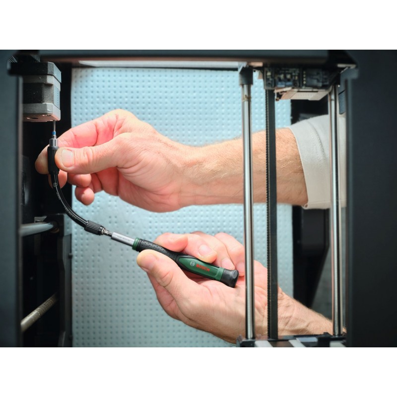 S vysoce kvalitní 20dílnou sadou přesných šroubováků Bosch rychle a efektivně opravíš malá elektronická zařízení, brýle, notebooky nebo hodinky. Přesný bitový šroubovák se vyznačuje štíhlým, ergonomickým designem s měkkou rukojetí a otočným krytem pro lepší manipulaci a pohodlí. To umožňuje snadné a rychlé otáčení a poskytuje optimální sílu pro kontrolované a přesné šroubování. Bity zůstávají pevně na svém místě díky silnému magnetickému držáku bitů v dříku. Šestihranný konec rukojeti zabraňuje odkutálení. Sada obsahuje 20 přesných bitů (PH000/00/0, SL1,5/2/2,5, TX2/3/4/5/6, TH8, HEX1,5/2, U2,6, Y1, Pentalobe 0,8/1,2, Triangle 2/2,3), běžnou prodlužovací tyč, flexibilní prodlužovací lištu a praktickou pinzetu pro jemné uchopení. Je uložena v praktickém plastovém kufříku pro snadné skladování a přepravu.