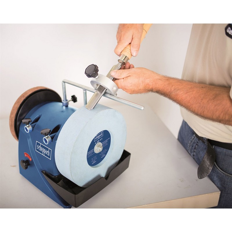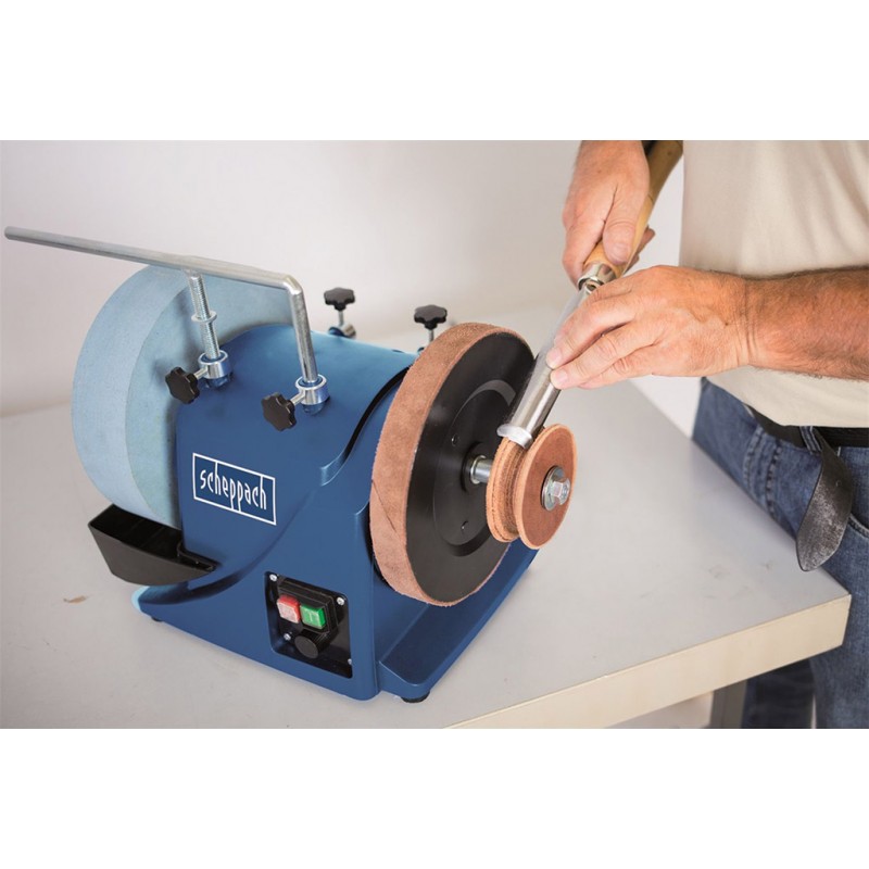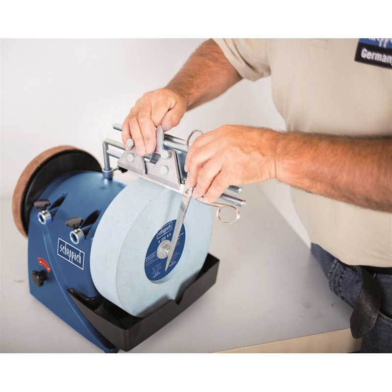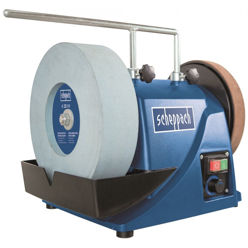 Špičkový brousící systém Tiger 3000 VS se hodí výborně jak pro domácí dílny, tak pro menší provozovny a dílny, které vyžadují perfektní ostrost svých nástrojů. Na ovládání brousícího systému Scheppach je skvělé, že díky jednoduchému ovládání a systému přípravků může nástroj dokonale nabrousit i úplný začátečník a uchránit tak mnohdy drahé nástroje před zničením. Základem pro správně nabroušené ostří je speciální široký kámen, který v sobě, pro ještě dokonalejší funkci, obsahuje mikročástice oxidu hliníku. Můžete tak, vedle běžných materiálů, brousit i ostří z tvrdokovu. Pro zahlazení všech mikrootřepů a docílení perfektního výsledku slouží vyměnitelný honovací kožený kotouč. Nastavitelná rychlost otáček slouží nejenom k nastavení optimální brousící rychlosti pro konkrétní druh materiálu, ale můžete díky ní i vyrovnávat rychlost kotouče, danou ubýváním jeho průměru při používání. Tělo samotného stroje a uložení kotoučů je velmi robustní konstrukce, indukční motor je moderní bezuhlíkové konstrukce, takže je velmi výkonný a tichý a nádoba na vodu je vyrobena z pevného, netříštivého plastu. Stroj je opatřen gumovými nožičkami. Jako standardní příslušenství je dodáván úhloměr, přípravek na broušení rovných ostří a abrazívní pasta. Velké množství dalších přípravků lze potom dle potřeby dokoupit.Technické parametry