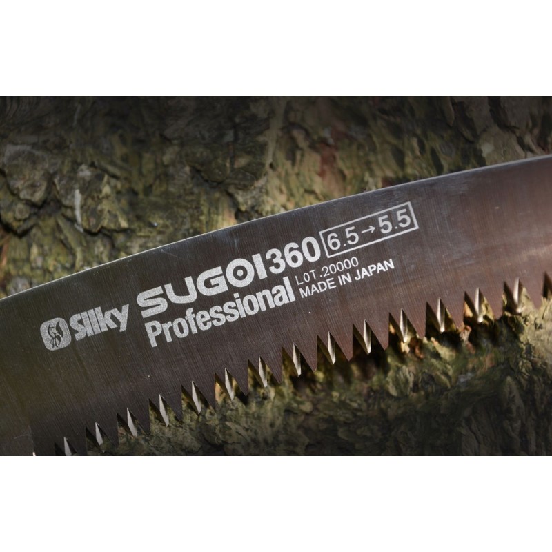 Pila Sugoi 360-6.5-5.5 je vybavena dlouhým pilovým listem o délce 360 mm, který je osazen extra agresivními zuby. Jedná se o tzv. progresivní konfiguraci zubů, kdy se hustota osazení pohybuje od 5,5 do 6,5 zubu na 3 cm. Zuby blíže rukojeti jsou jemnější pro snadné zahájení řezu, zatímco zuby na konci čepele jsou hrubší a zajišťují rychlejší úběr materiálu a efektivnější řez.
