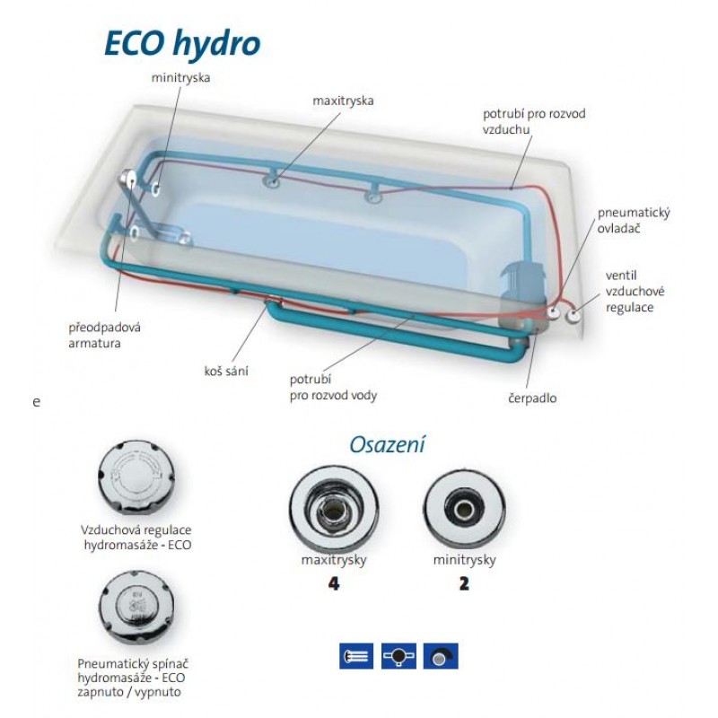 Hydromasážní systém je osazen 4-mi maxitryskami a 2-mi minitryskami. Tyto vytvářejí příjemný proud vody obohacený vzduchem. Moderní regulační a ovládací prvky zaručují velmi jednoduché a pohodlné ovládání. Spuštění a vypnutí se provádí pneumatickým spínačem, který je umístěn na horním okraji vany. Vzduchová regulace obohacuje vodní masáž vzduchem, který mění účinky masáže. Intenzitu masáže lze měnit otevíráním nebo zavíráním maxitrysek - max. 2 ks současně.