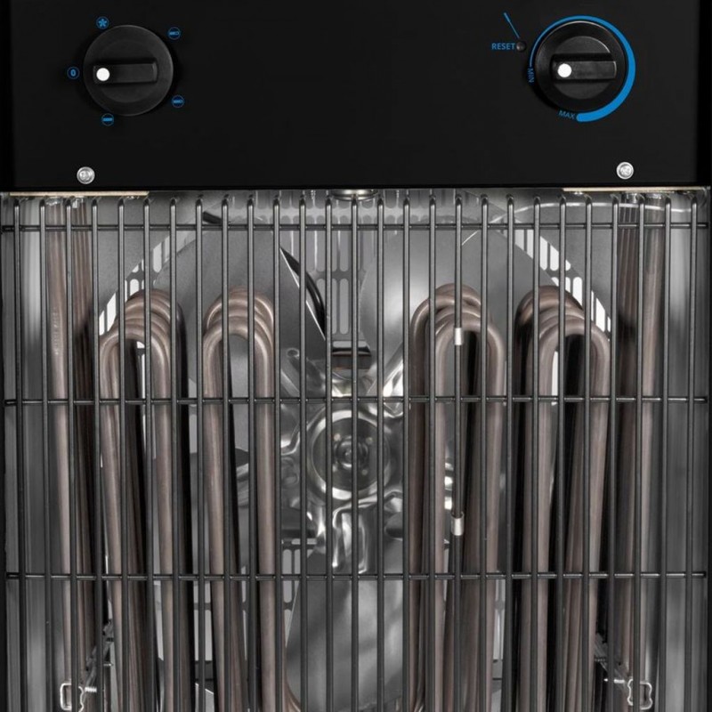 Přímotop pracuje na třífázové napětí 400 V, dosahuje průtoku vzduchu 1292 m3/h a je vybaven prostorovým termostatem, který zajišťuje automatické udržování nastavené teploty. Ocelová konstrukce s ochrannou mřížkou a krytí IPX4 zaručují bezpečný a spolehlivý provoz i v náročnějších podmínkách.