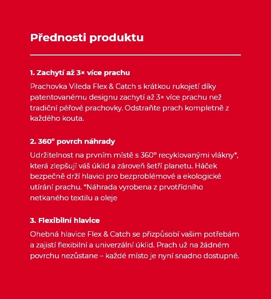 Vylepšete svůj úklidový režim s Vileda Flex & Catch, revoluční prachovkou navrženou pro výjimečnou účinnost a udržitelnost. Díky patentované hlavici, která zachytí až 3× více prachu než tradiční péřové prachovky. Snadno dosáhne do každého místa a kouta z libovolného úhlu a zajišťuje dokonale čistý domov.
