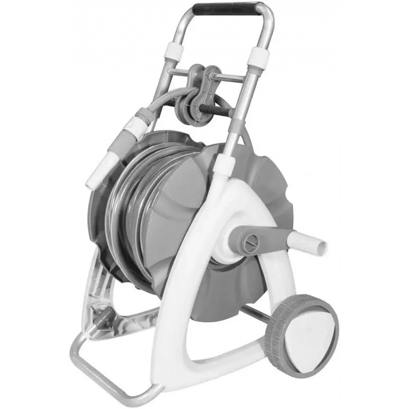 Vozík je vybaven teleskopickou rukojetí, praktickou klikou pro navíjení a vedením hadice, které zajišťuje rovnoměrné ukládání po vrstvách. Díky rychlospojkám a postřikovači je okamžitě připraven k použití.