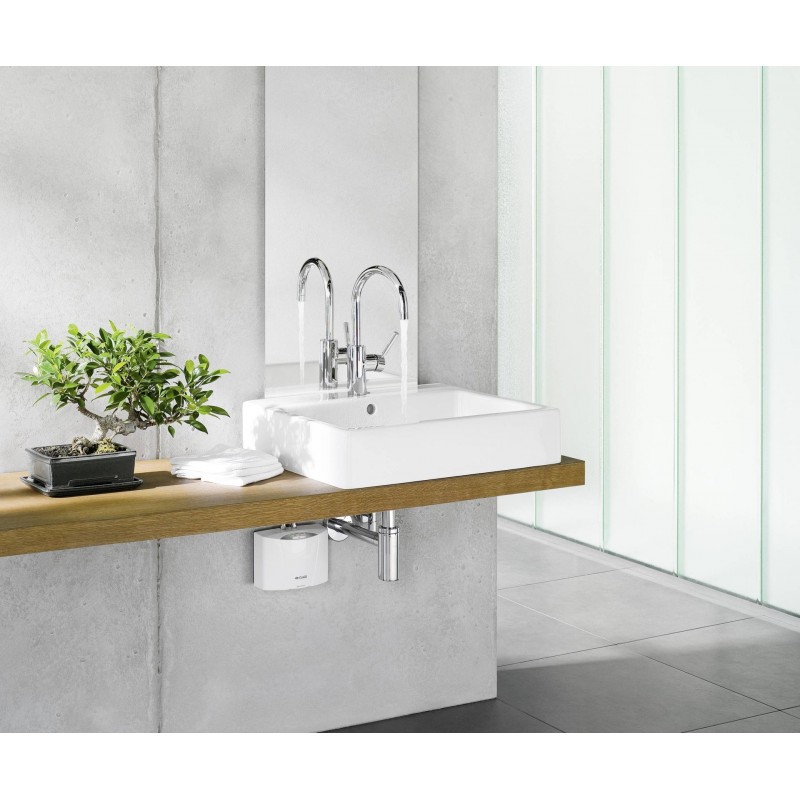 Voda je ohřívána přímo při průtoku bez zásobníku a bez pohotovostních ztrát. Elektronická regulace výkonu automaticky přizpůsobuje topný výkon aktuálnímu průtoku a vstupní teplotě vody a udržuje stabilní výstupní teplotu až do limitu výkonu přístroje. Instalace pod umyvadlem minimalizuje tepelné ztráty v potrubí a snižuje spotřebu energie.