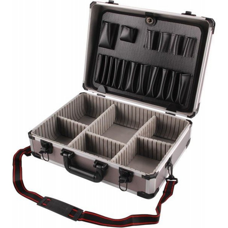 EXTOL CRAFT kufr na nářadí hlíníkový, 450x330x150mm, šedá barva 8806000přepážky uvnitř kufru lze přenastavit nebo úplně vyndat, látkový panel se 17 kapsami na nářadí usnadňuje organizaci nářadí v kufru