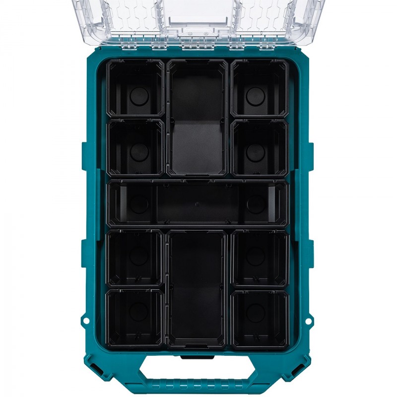- Má různé velikosti zásobníků pro uspořádání malých i velkých dílů, s nízkoprofilovým designem pro organizaci malých dílů.