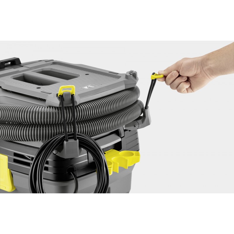 Spolehlivý vysavač NT 30/1 Ap Te L se stane nedocenitelným pomocníkem při montážích i úklidu v dílně. Jeho 300 mm široká podlahová hubice účinně vyčistí suché i mokré nečistoty. A když potřebujete vysát rohy nebo úzké skuliny, pomůže vám spárová hubice. Silný motor s příkonem 1380 W vyvine podtlak, který si poradí i s tou nejodolnější špínou. Kvalitní plochý skládaný filtr účinně zachytí částice prachu třídy L. Díky funkci poloautomatického čištění ApClean jej při zanesení snadno uvolníte pouhým stiskem tlačítka. Součástí zařízení je praktická zásuvka k připojení elektrického nářadí. Ta je navíc vybavena spínací automatikou, takže se sání spustí pouze ve chvíli, kdy nářadí skutečně používáte. Plochá hlavice vysavače vám poslouží i jako odkládací plocha pro šroubky nebo drobné nástroje. Ke stroji lehce připevníte také přívodní kabel a hadici, takže vám při skladování nezabere mnoho místa.