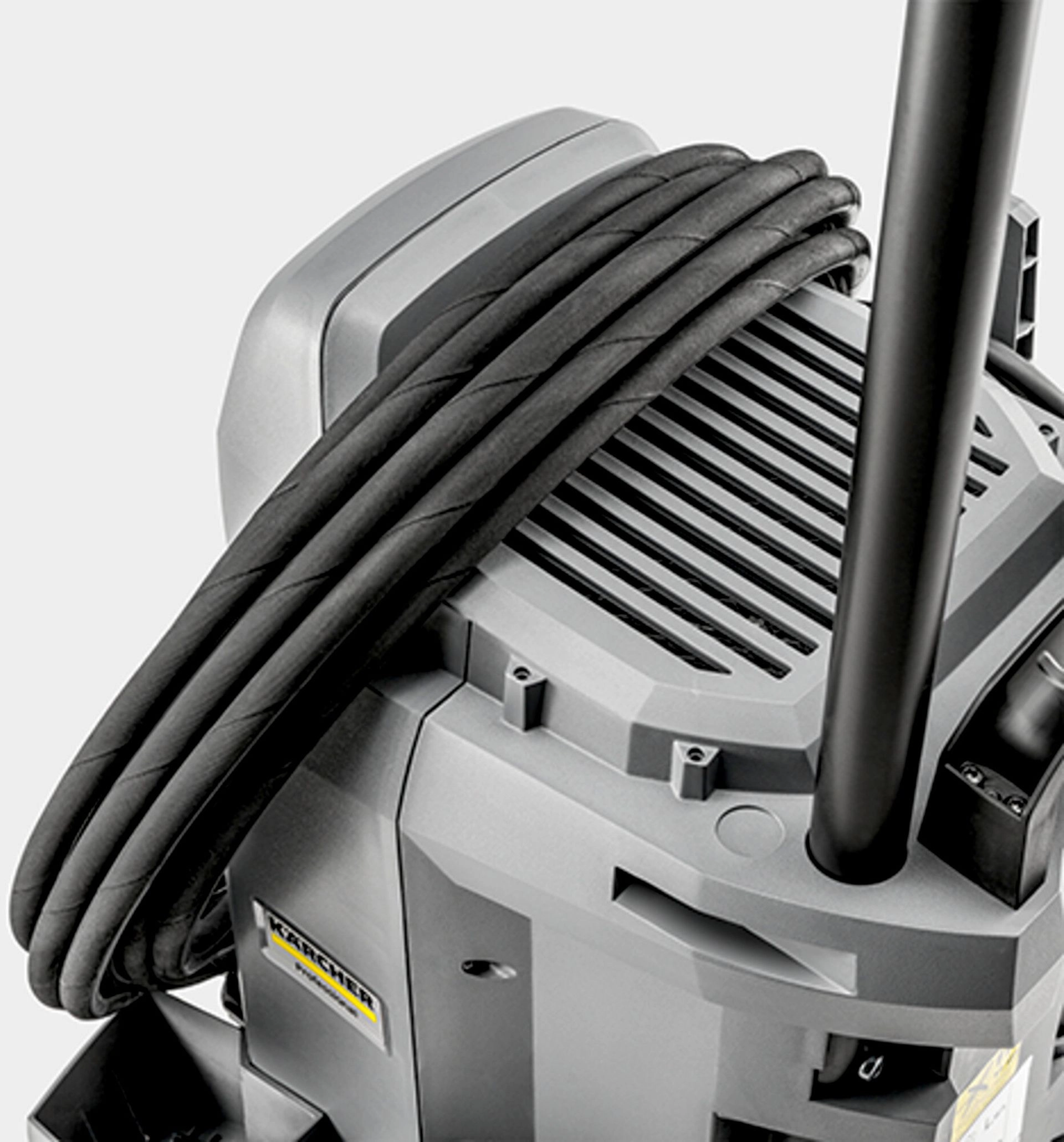 Držák pro uložení trysky, integrované háčky na kabely a držák pracovního nástavce zajišťují přehledné a bezpečné uložení příslušenství.